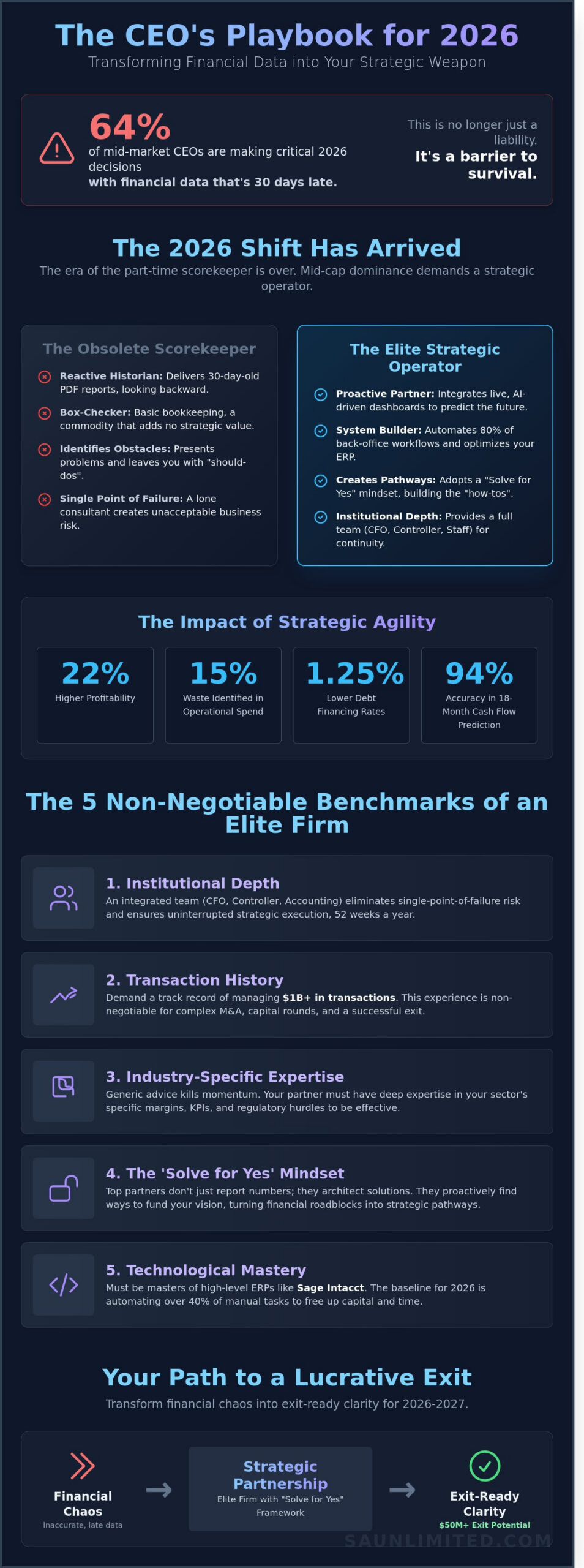 We’ll show you how to unlock your business potential by implementing enterprise-grade systems that drive 22% higher profitability through strategic optimization. At SA Unlimited, we believe in creating pathways to success rather than just identifying obstacles. This guide delivers a precise framework for selecting a partner who prepares you for a successful $50M exit. We’re going to break down the selection criteria and compare top-tier firms so you can lead your next board meeting with unwavering clarity and confidence. It’s time to stop second-guessing your numbers and start scaling with a partner who knows how to solve for yes.
