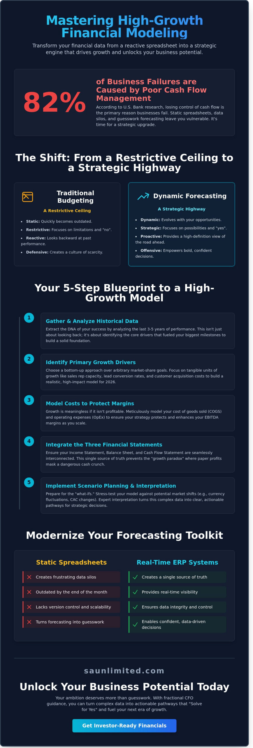 According to research from U.S. Bank, 82% of businesses fail because they lose control of their cash flow. You’ve likely felt that tension when your static spreadsheets are already outdated by the time you’ve finished the monthly close. It’s exhausting to manage data silos between accounting and operations that turn building a financial forecast model into a frustrating exercise in guesswork. At SA Unlimited, we know that your ambition deserves more than a reactive spreadsheet; it requires a strategic engine that drives growth.