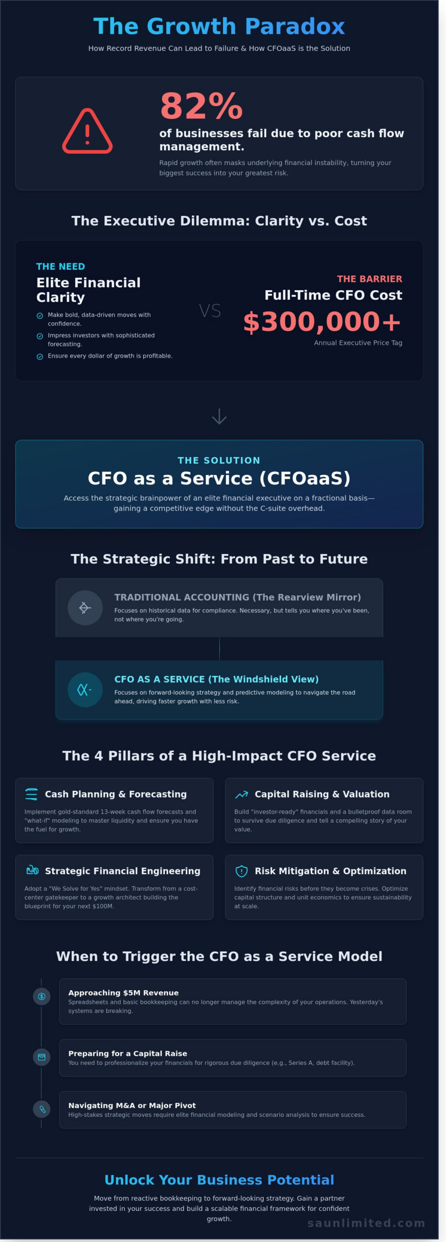 A high-impact CFO service isn’t a luxury; it’s a growth engine designed for leaders who refuse to settle. To scale effectively, you need more than a bookkeeper or a standard accountant. You need a strategist who builds the financial architecture of your future success. This transition typically happens when a company hits the $5M revenue mark and discovers that yesterday’s spreadsheets can’t handle tomorrow’s complexity. By leveraging cfo as a service, founders gain access to the same financial rigor used by Fortune 500 companies without the $300,000 annual salary burden of a full-time hire.