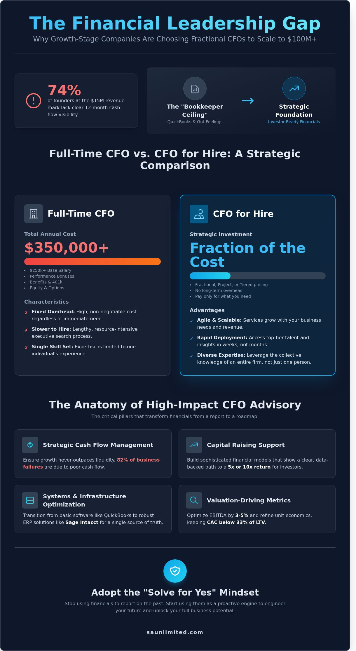 At SA Unlimited, we believe your financial leadership should create pathways, not roadblocks. This article reveals how the right strategic partnership allows you to “Solve for Yes” and scale your operations without the $350,000 overhead of a full-time executive. We’ll explore the blueprint for moving from messy spreadsheets to investor-ready financials and a clear roadmap to $100M+ in revenue. It’s time to unlock your business potential and make the bold moves your vision requires.