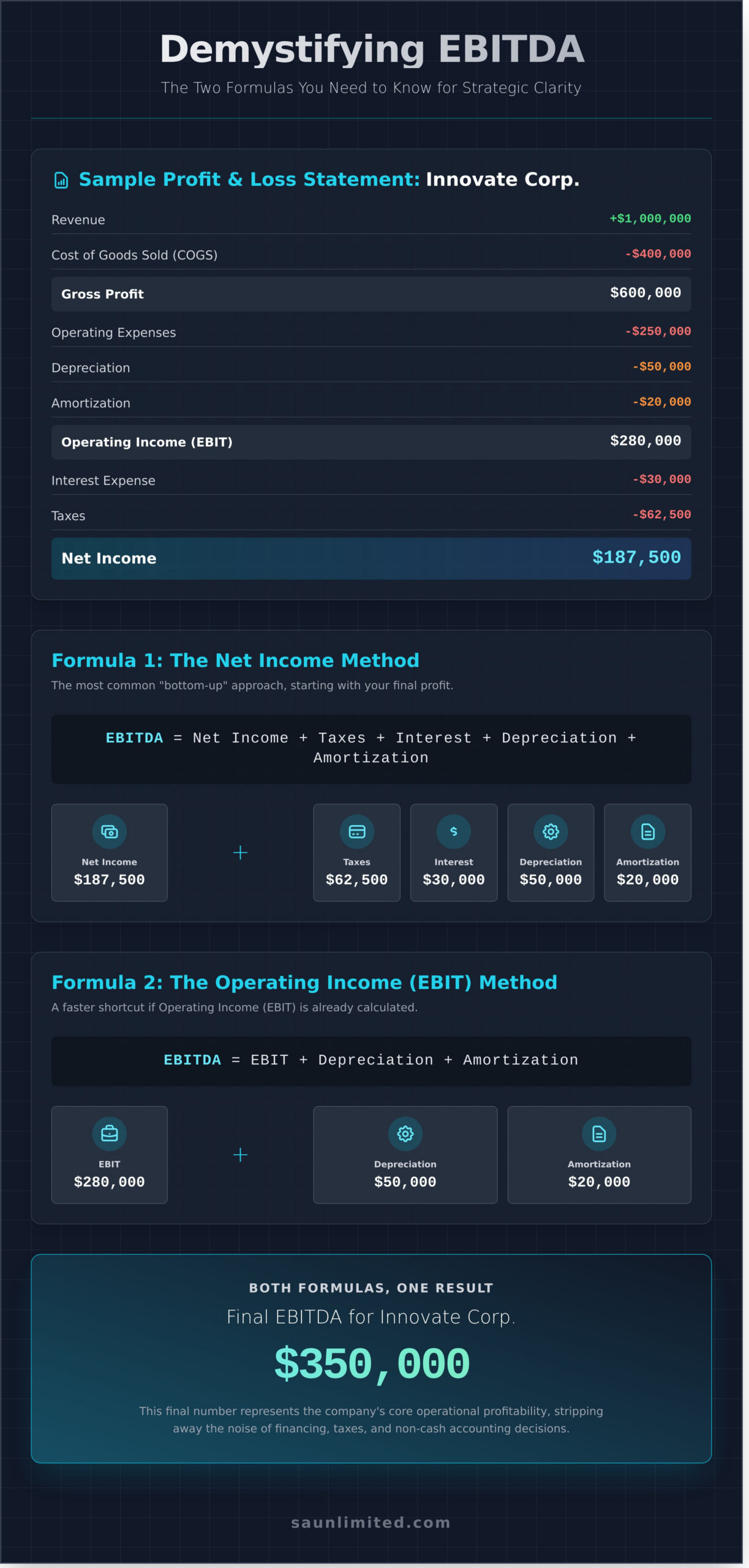 To unlock strategic clarity, you must first know your numbers. Fortunately, calculating this core metric isn’t complex. While the concept is straightforward, mastering the nuances of calculating EBITDA is crucial for accurate financial analysis. There are two primary, reliable formulas to get you to the same powerful number. Let’s walk through them using a simplified Profit & Loss (P&L) statement for a hypothetical company, Innovate Corp.