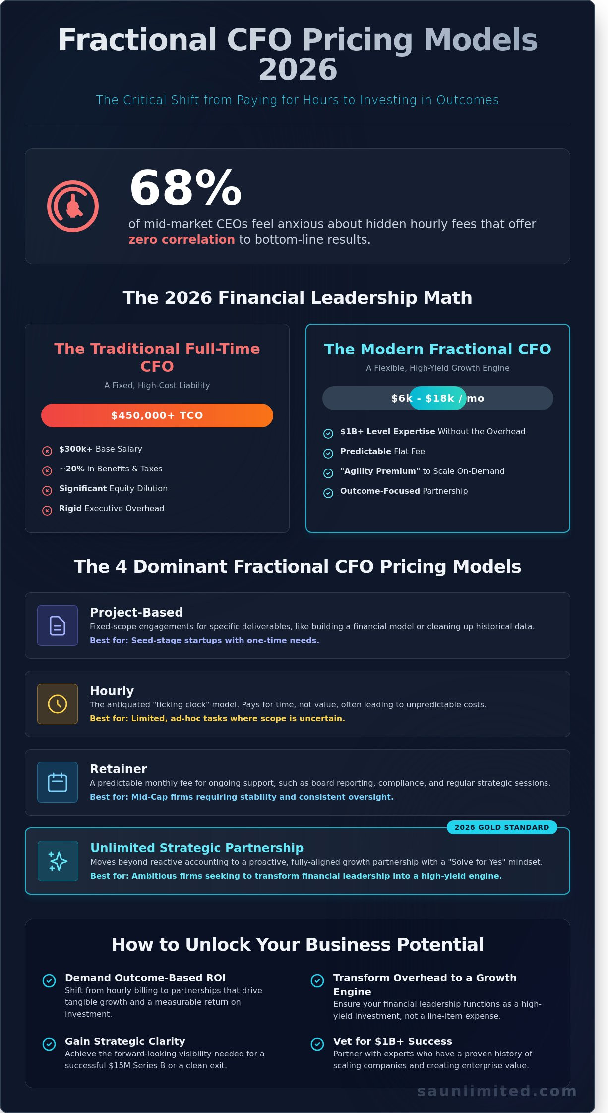 - Navigate the four dominant fractional cfo pricing models 2026 offers to identify which structure—from project-based to unlimited—best aligns with your company’s current scale.