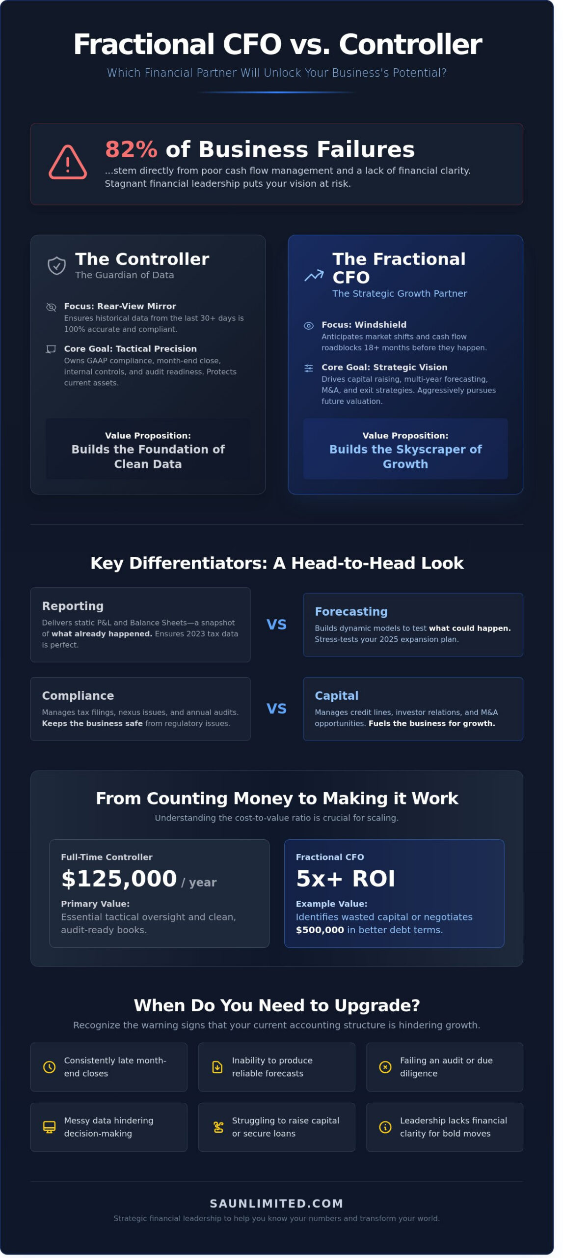 A 2024 analysis reveals that 82% of business failures stem directly from poor cash flow management and a lack of financial clarity. If your current accountant has hit a ceiling, you’re likely staring at messy data that makes scaling feel like a dangerous gamble. We understand the frustration of having a vision for 2026 but lacking the accurate forecasting needed to raise capital or optimize operations. It’s time to stop guessing and start leading. Determining whether you need a fractional cfo vs controller is the pivotal decision that will allow you to know your numbers and transform your world.