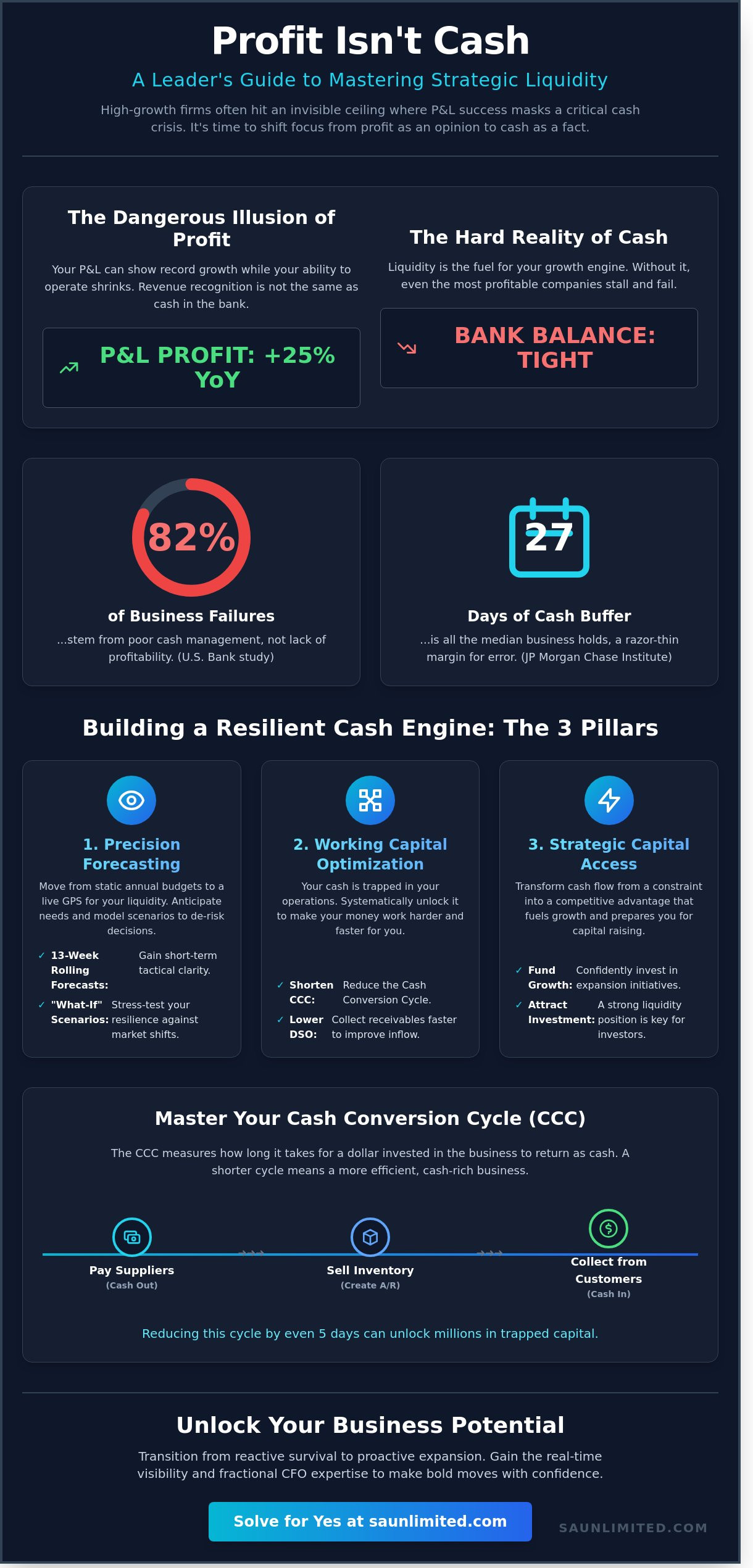 Your P&L statement shows a record year, yet your bank balance tells a different story. This is the invisible ceiling. In 2026, mid-cap firms are discovering that accounting profit is a vanity metric; liquidity is the only reality that keeps the lights on. A 2024 study by U.S. Bank found that 82% of business failures stem from poor cash management. For a high-growth firm, the danger is amplified. Rapid scaling often requires upfront investment in inventory, talent, and infrastructure long before the first invoice is paid. This gap creates a “Growth-Induced Cash Deficiency” that can sink even the most profitable enterprises. Moving from reactive firefighting to proactive strategic planning is the only way to unlock your business potential.