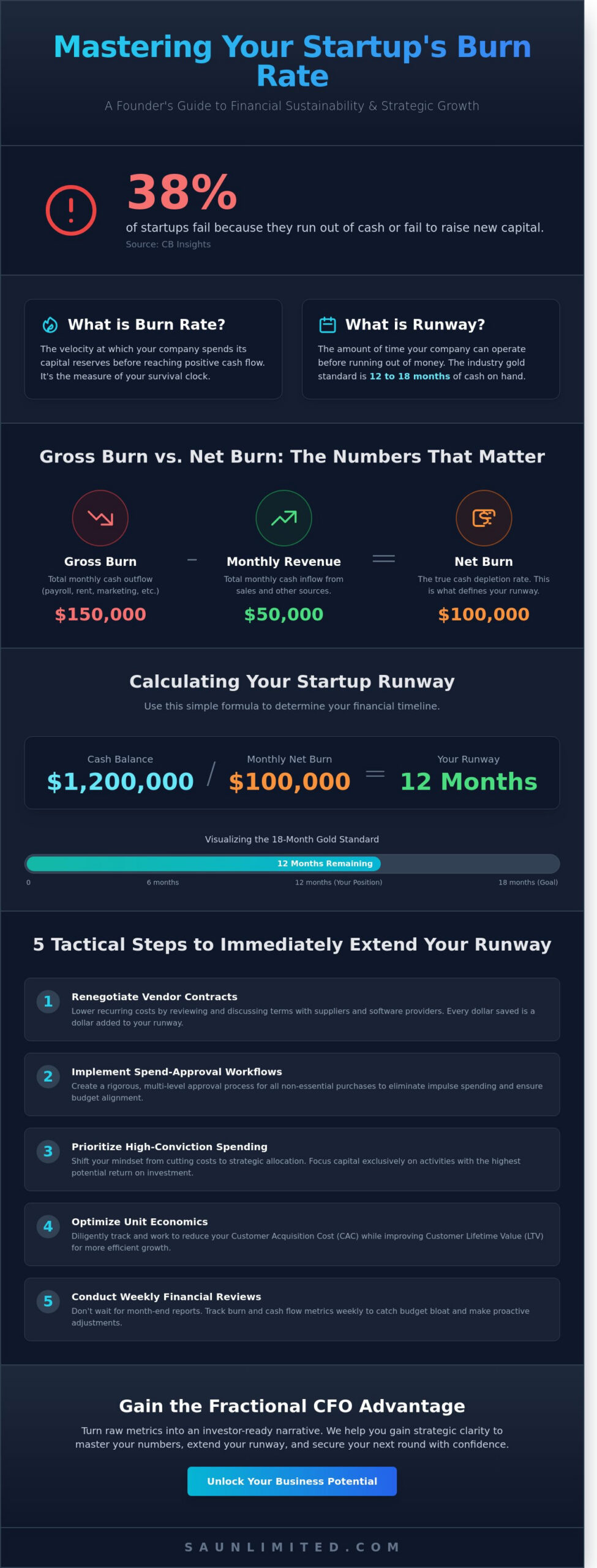 According to research from CB Insights, 38% of startups fail simply because they run out of cash or fail to raise new capital. It’s a sobering reality that transforms the “Valley of Death” from a metaphor into a looming threat. You understand that every dollar spent must be a strategic investment, yet the pressure of high headcount costs and aggressive growth targets often makes managing burn rate startup operations feel like a defensive struggle rather than a calculated offensive. At SA Unlimited, we believe your financial metrics should empower you to make bold moves, not hold you back.