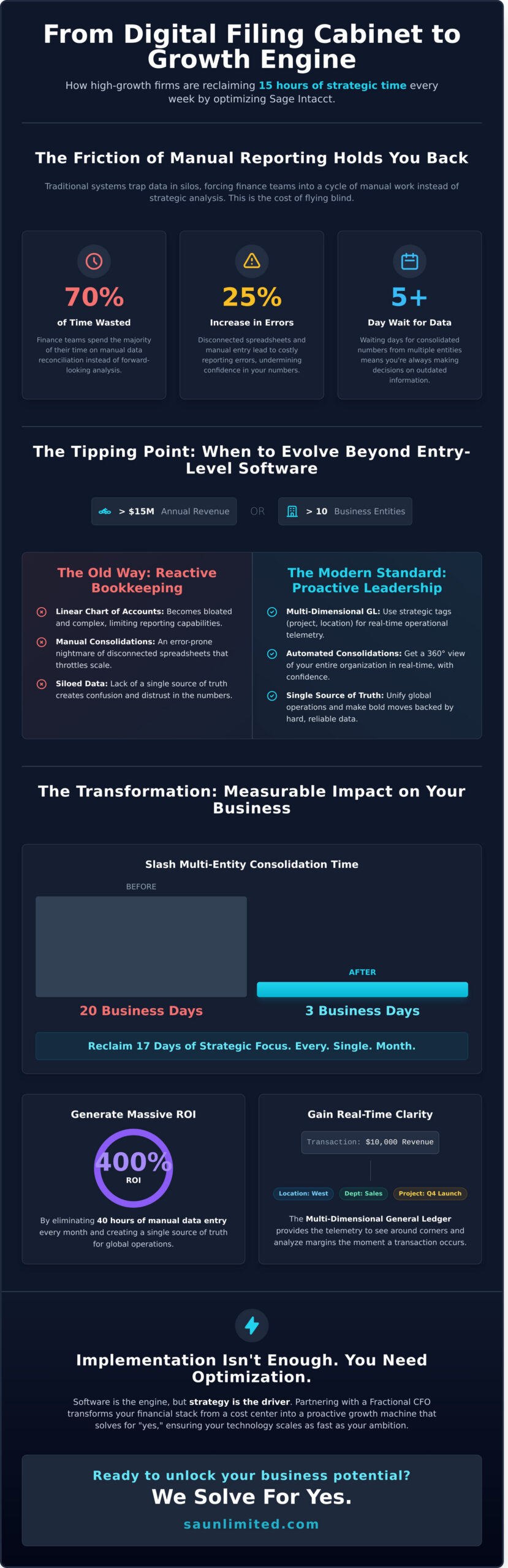 Most leaders treat their accounting software as a digital filing cabinet, but that mindset is costing your team 15 hours of strategic decision-making time every single week. You’ve felt the friction of manual Excel reporting. When you’re managing three or more entities, waiting five days for consolidated numbers feels like flying a plane in a thick fog bank. It’s a common frustration for high-growth firms that need to move fast but feel held back by a lack of real-time visibility. At SA Unlimited, we solve for yes by turning these obstacles into pathways for expansion.